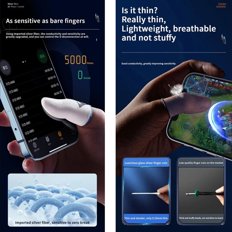 تصميم رفيع للغاية 0.25 مم، يناسب معظم أطراف الأصابع والأصابع بشكل أفضل بزاوية 360 درجة، وخفيف الوزن مثل لا شيء، ولا يؤثر على اللعبة.