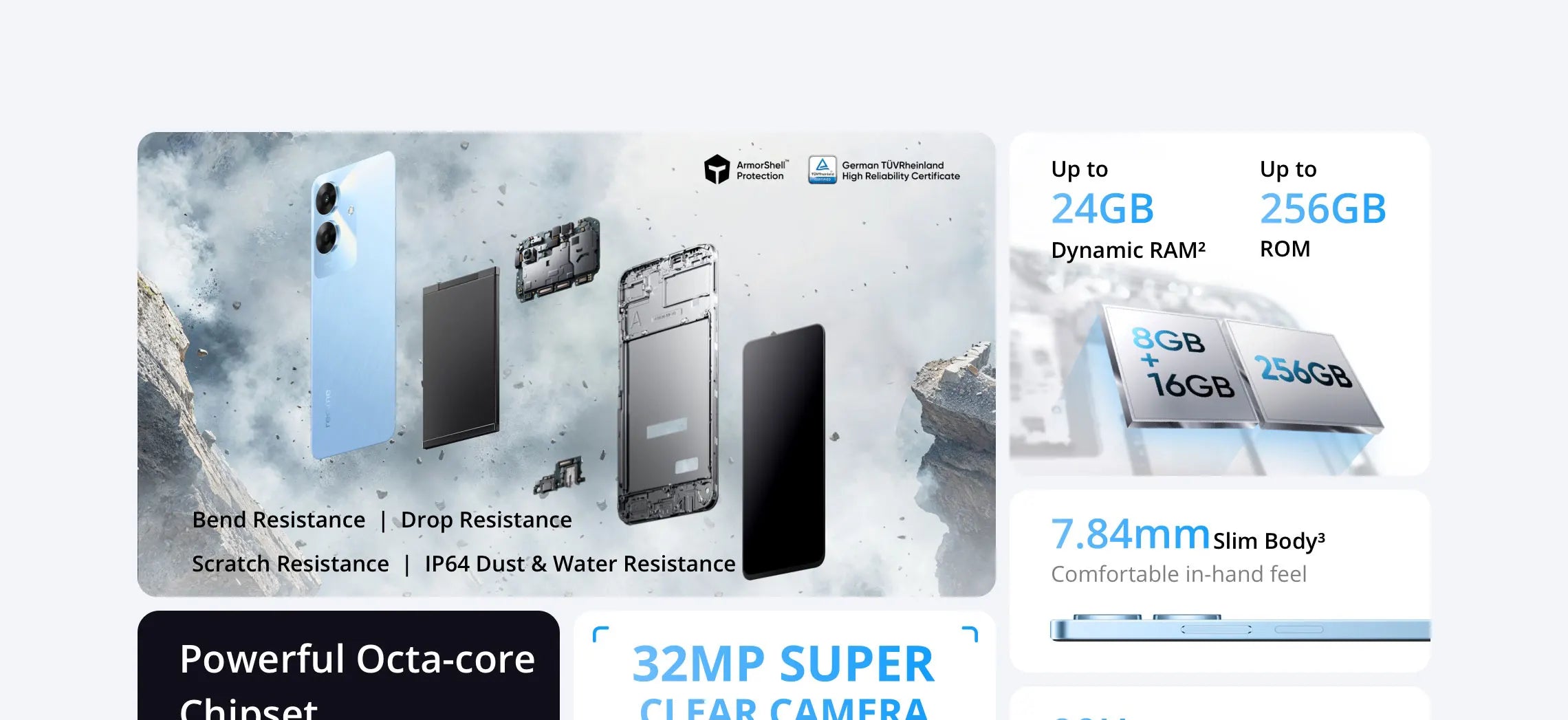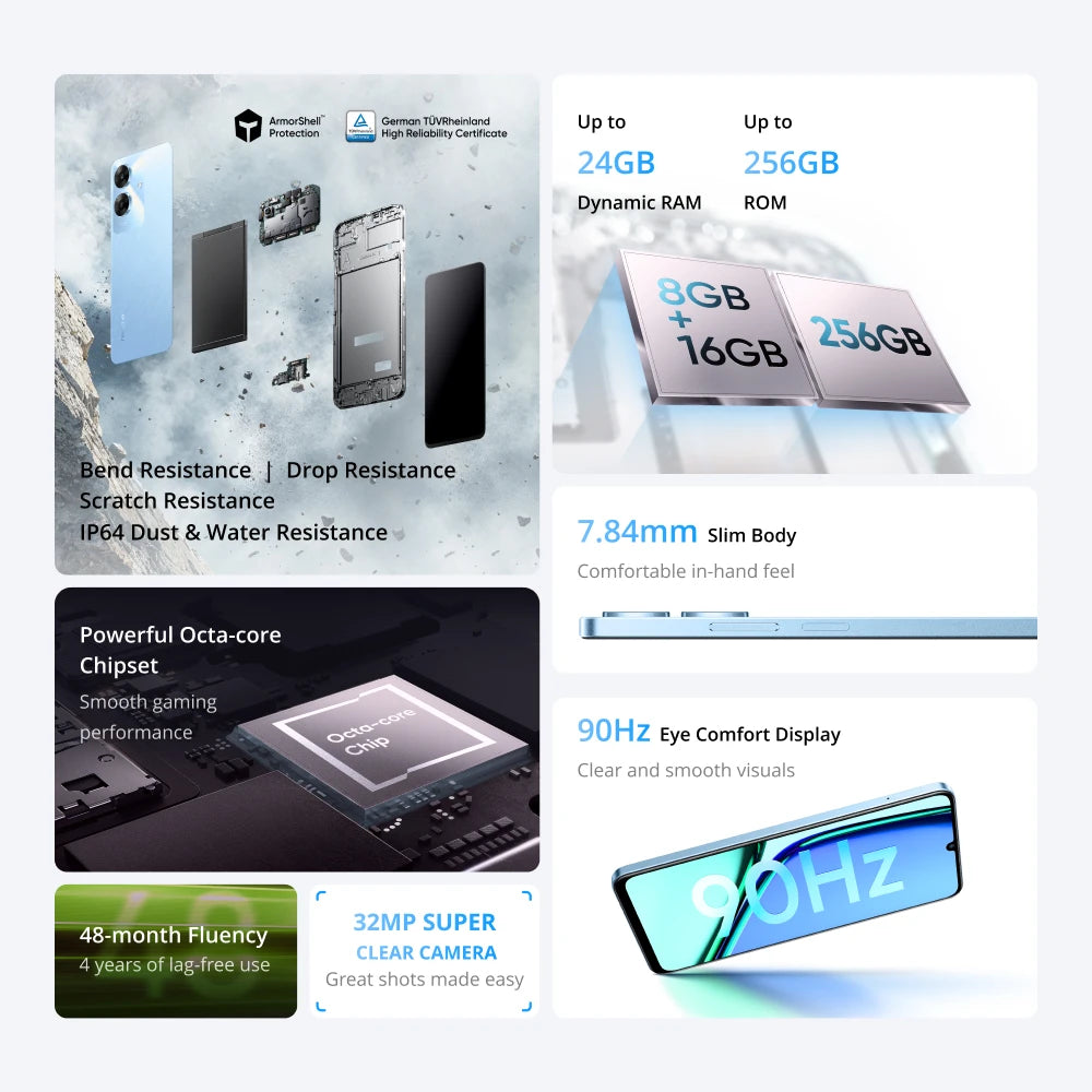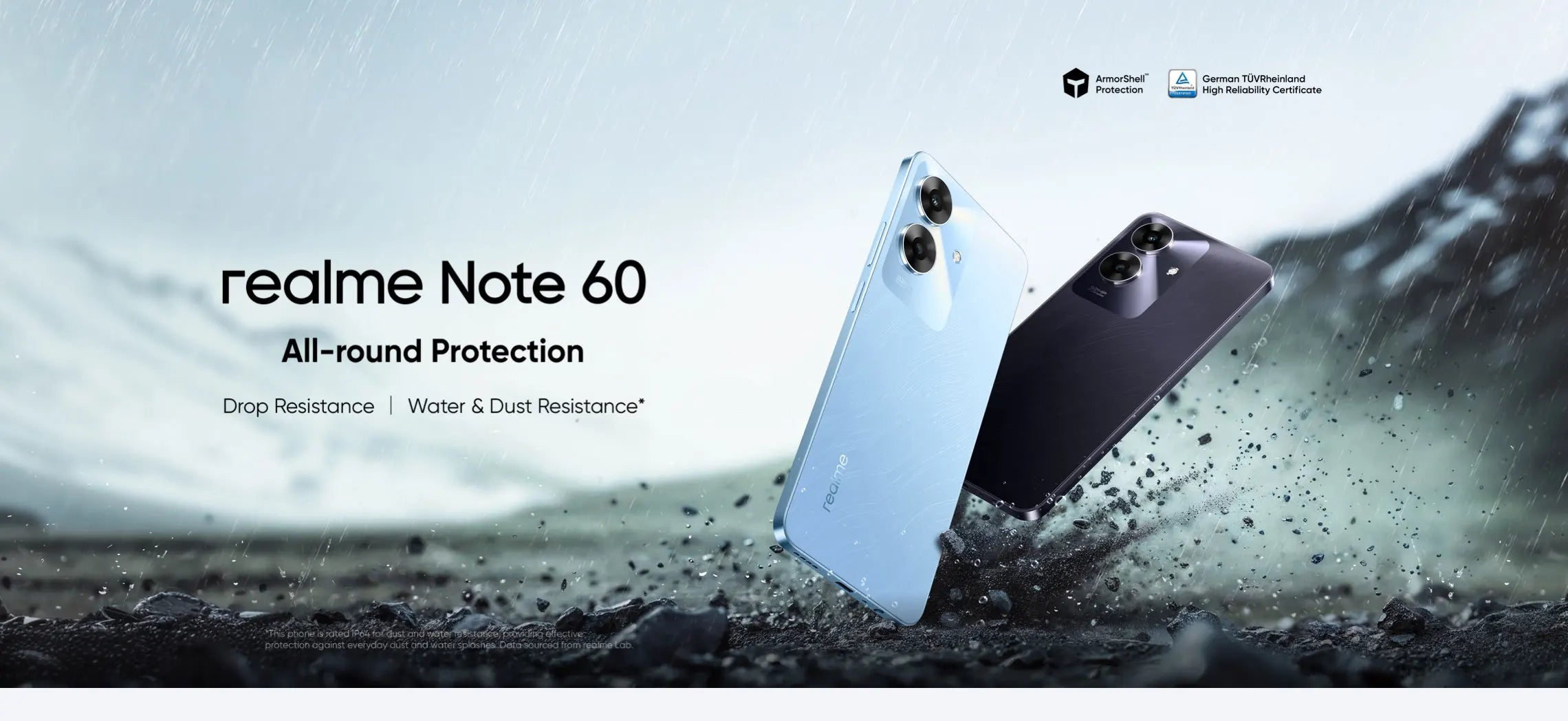 realme Note 60*1، كابل USB Type-C*1، محول 10 وات*1، حافظة حماية*1، إبرة بطاقة SIM*1، دليل سريع*1، معلومات مهمة عن المنتج (بما في ذلك بطاقة الضمان)*1