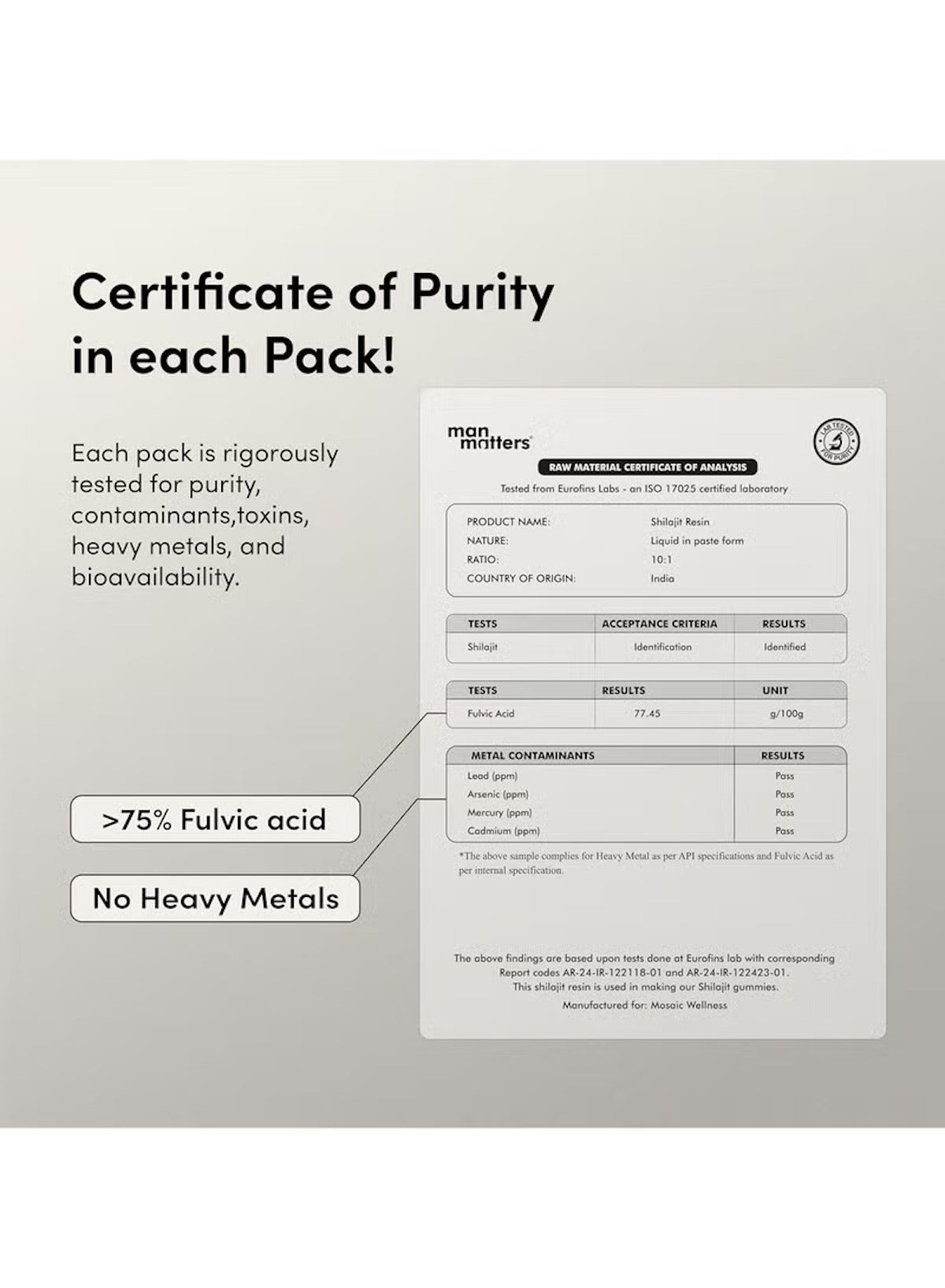 Experience the power of nature and science combined with Man Matters Pure Himalayan Shilajit Gummies, crafted for enhanced strength, vitality, and recovery. Sourced from the pristine Himalayas at 18,000 ft, our organic Shilajit resin is enriched with KSM-66 Ashwagandha, Gokshura, Black Musli, and Ginseng—a potent blend to fuel your energy, stamina, and overall wellness.