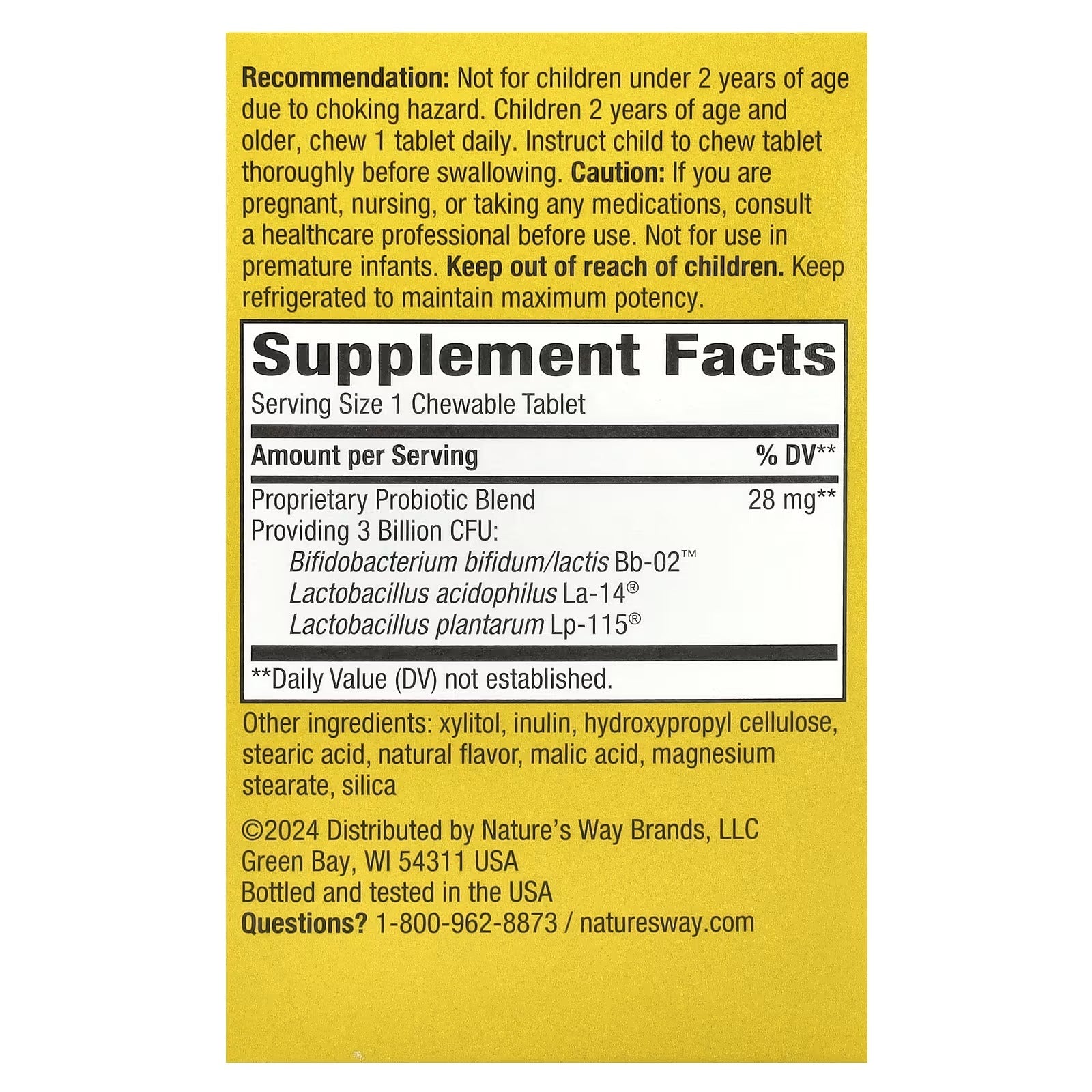 Nature’s Way Primadophilus® Kids Probiotic Chewables are specially formulated for children ages 2 and up to support digestive and immune health. With a kid-friendly cherry flavor and 3 billion CFU per serving, these chewable tablets make daily probiotic support easy and enjoyable for growing kids.