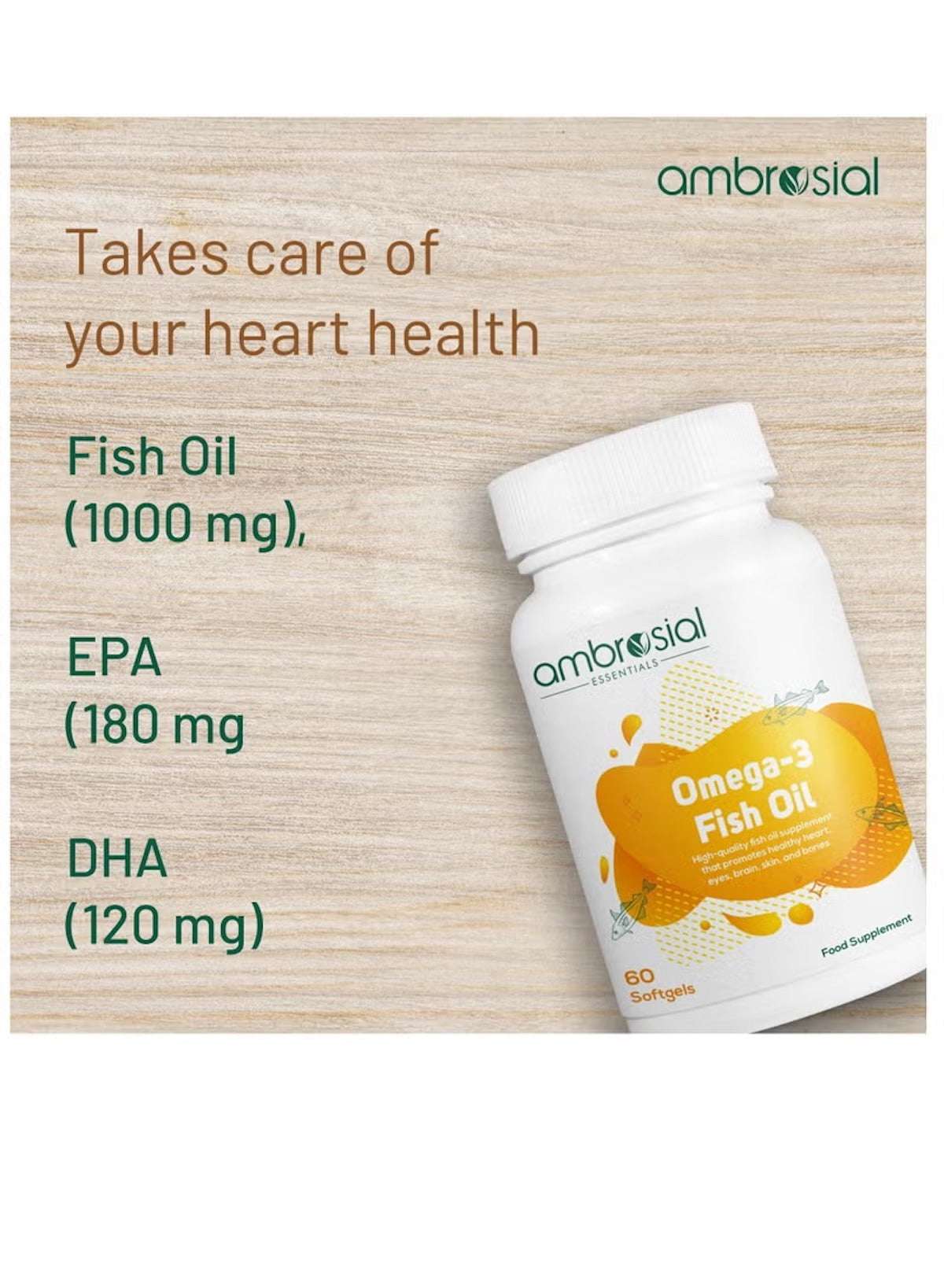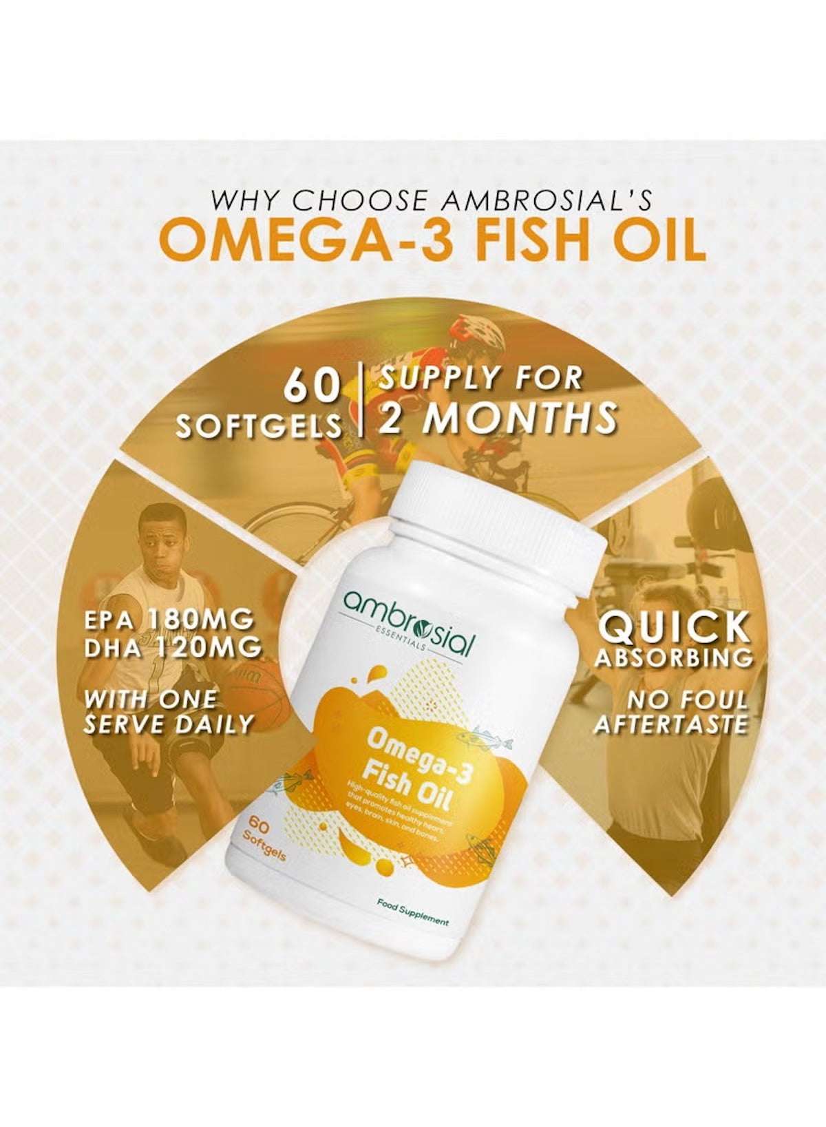 Ambrosial Omega-3 Fish Oil delivers premium-quality essential fatty acids to support heart, brain, and eye health. Each softgel provides 1000 mg of Omega-3, including 180 mg of EPA and 120 mg of DHA, key components known to maintain cardiovascular function and cognitive performance.