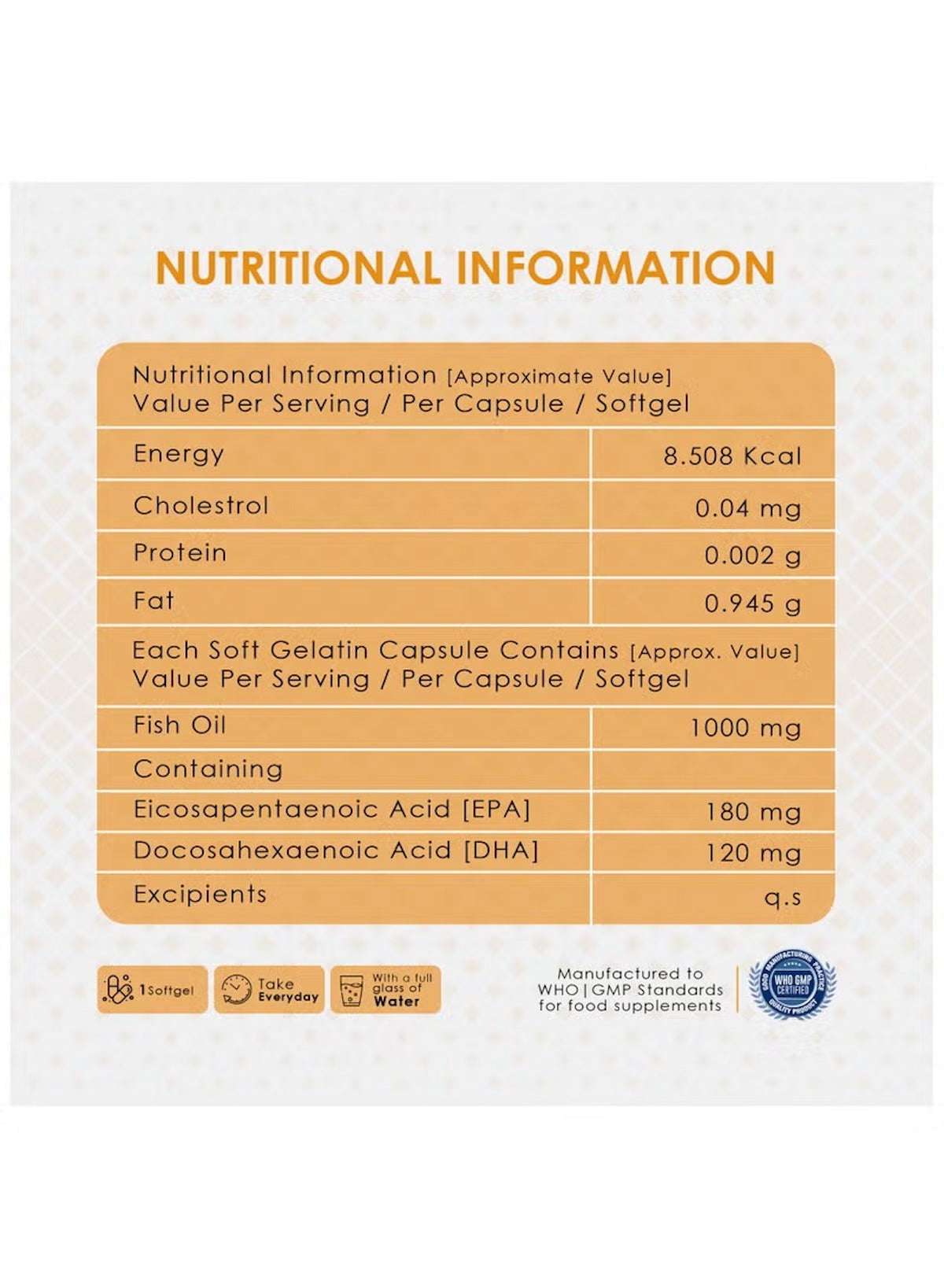 Omega-3 Content: 1000 mg per softgel (EPA 180 mg, DHA 120 mg)