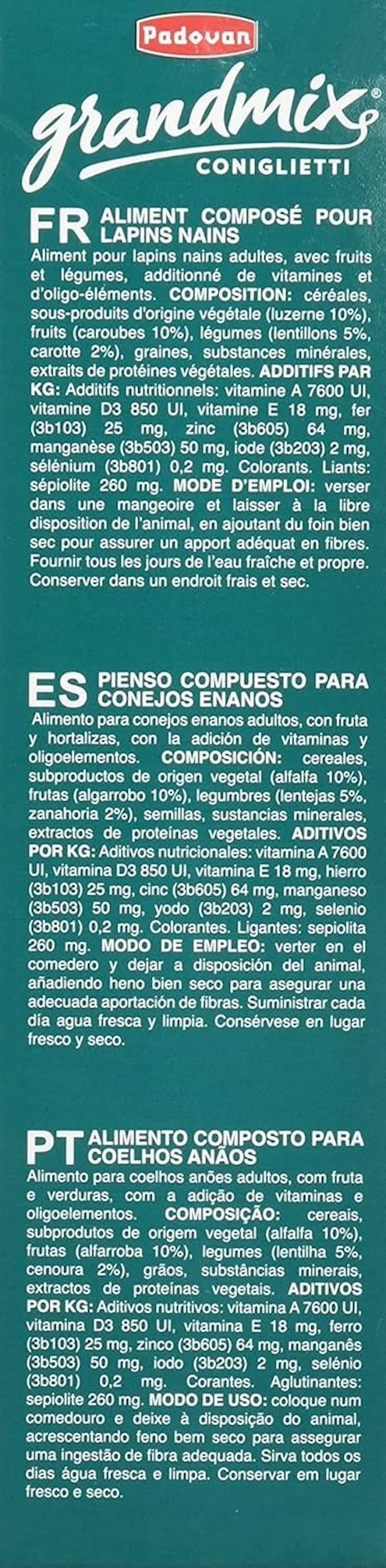Padovan Grandmix Coniglietti Rabbit Food is a specially formulated mix designed to meet the nutritional needs of rabbits. This premium blend contains selected cereals, dried vegetables, and vitamins that help maintain overall health and vitality. It supports strong teeth, a shiny coat, and proper digestion. Ideal for daily feeding, this nutritious formula ensures your rabbit enjoys a balanced and tasty diet that promotes long-term well-being.