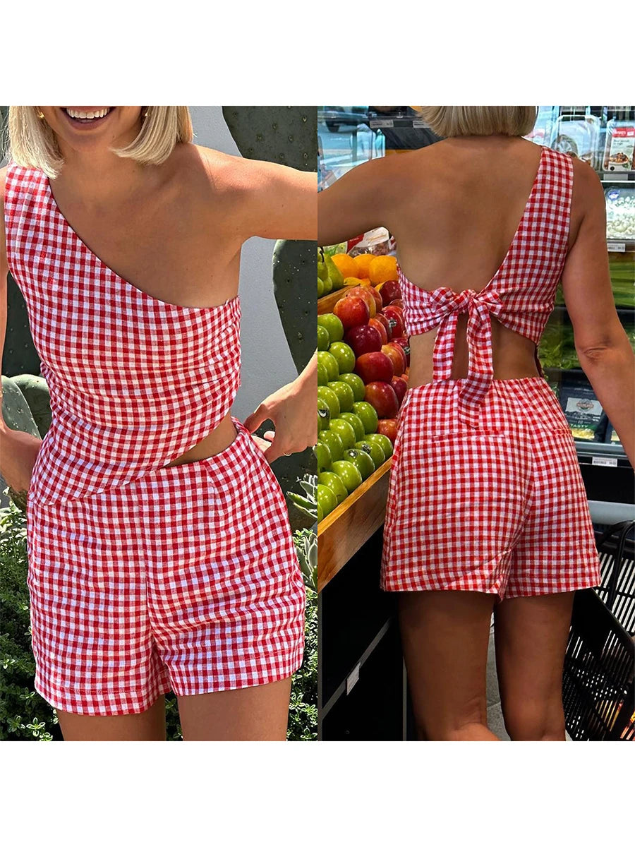 طقم ملابس نسائية كاجوال مكون من قطعتين، قميص داخلي بدون أكمام بكتف واحد + شورت بخصر عالٍ، ملابس مريحة
