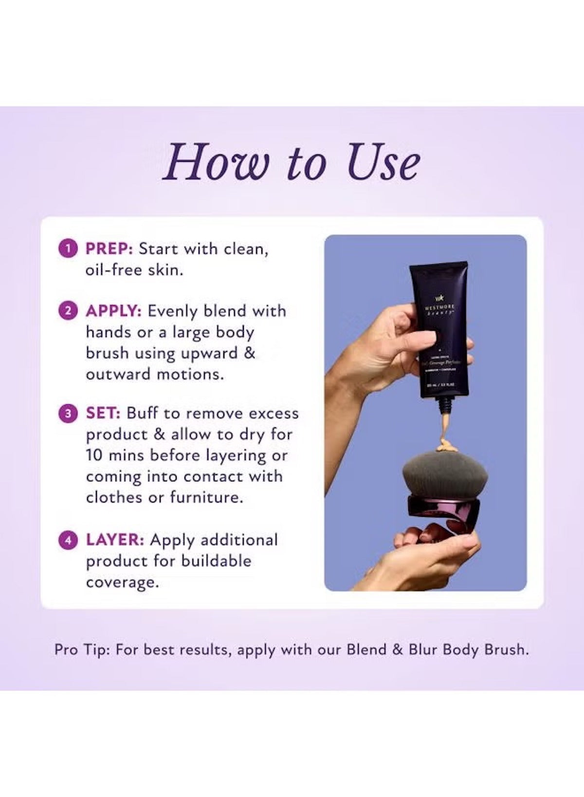 For best results, exfoliate and prime with oil-free products before application. Blend evenly in upward motions and let set for 10 minutes. For an airbrushed finish, use with the Blend & Blur Body Makeup Brush.