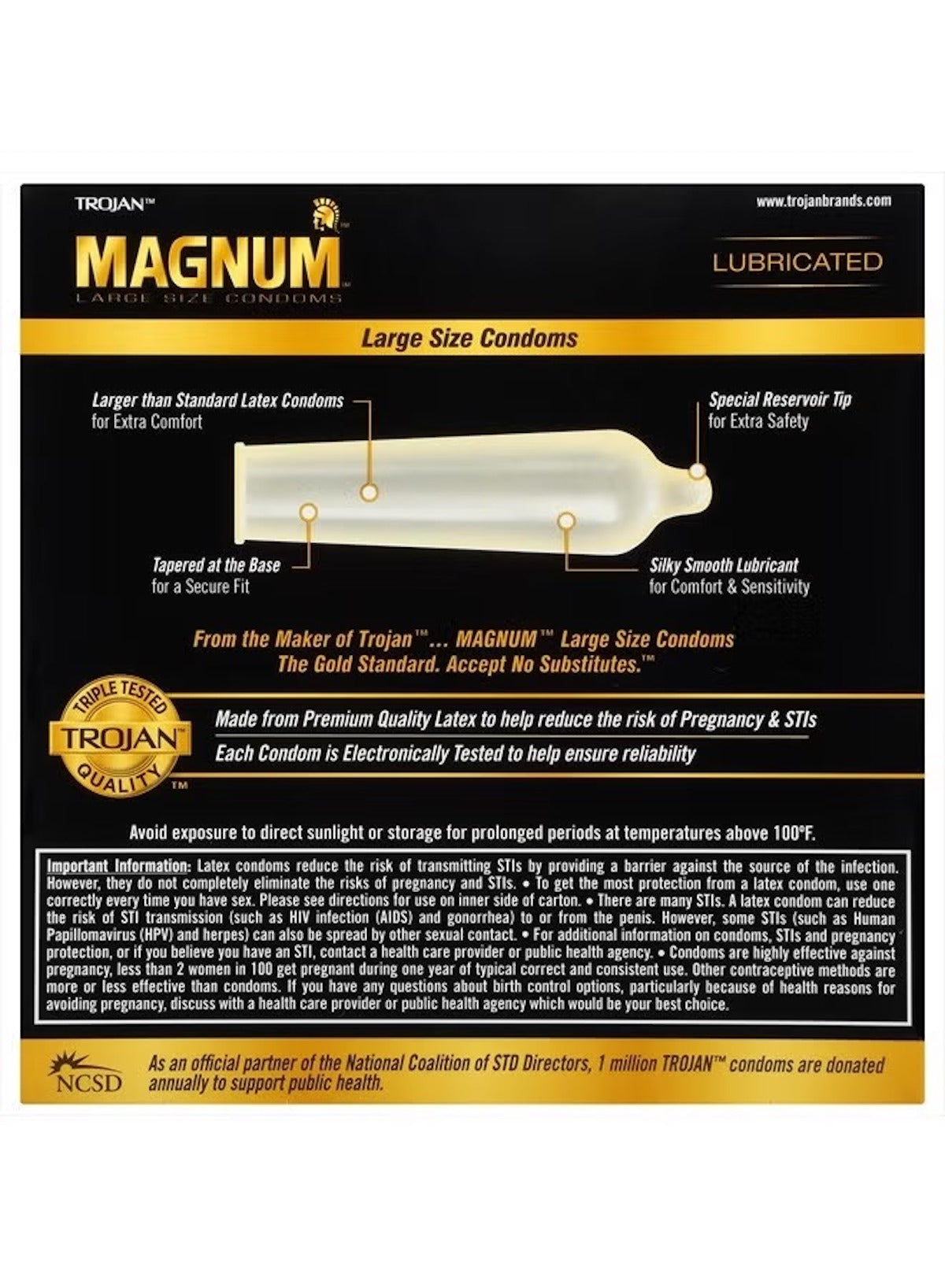 Experience comfort and reliability with TROJAN Magnum Lubricated Large Condoms, designed for men who need a larger, more comfortable fit. These premium latex condoms feature a silky-smooth lubricant for enhanced sensitivity and a wider, contoured shape for added comfort. Each condom includes a special reservoir tip for extra safety and is electronically tested to ensure dependable protection. Trusted for over 100 years, TROJAN is America’s No. 1 condom brand, promoting safe, healthy, and pleasurable intimacy.
