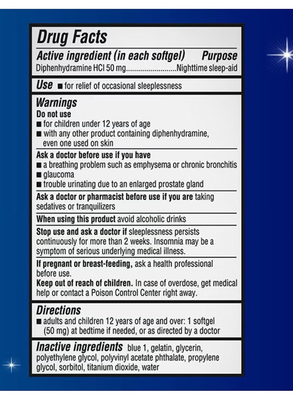 Active Ingredient: Diphenhydramine HCl (50 mg per softgel)