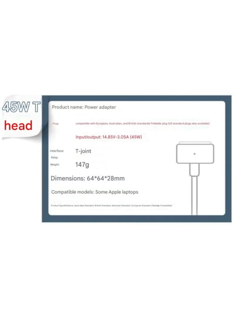 This compact and dependable 45W T-Tip power adapter is designed for selected Apple laptops, delivering stable and efficient charging. Featuring a foldable plug and built-in safety protections, it’s ideal for home, office, or travel use.