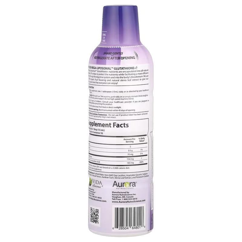 Aurora Nutrascience Mega-Liposomal™ Glutathione+ with Vitamin C – Organic Fruit, 750 mg, 16 fl oz (480 ml)