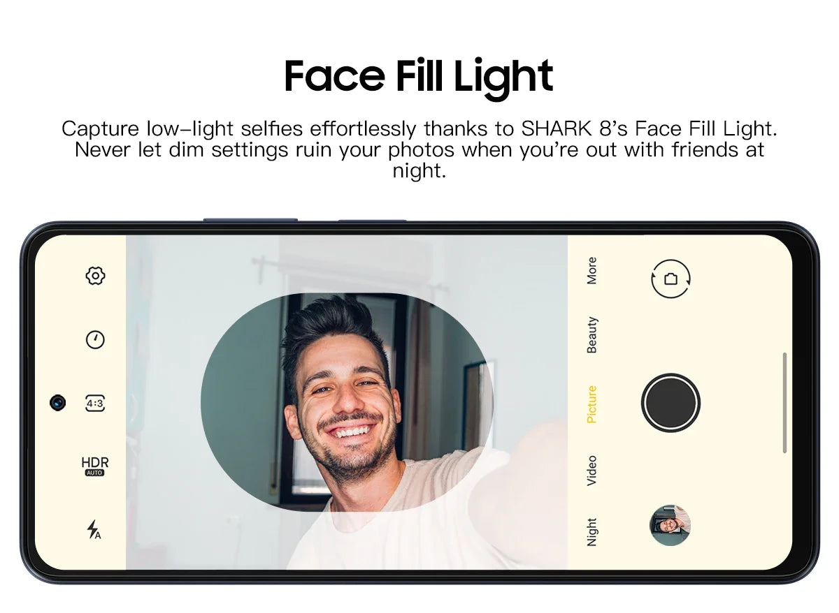 Capture low-light selfies effortlessly thanks to SHARK 8's Face Fill Light. Never let dim settings ruin your photos when you're out with friends at night.