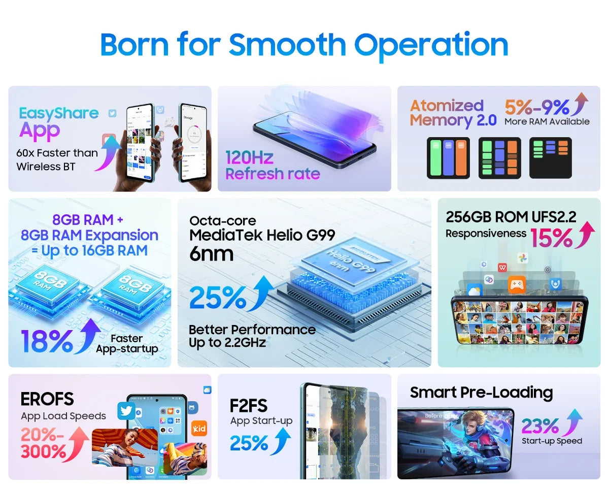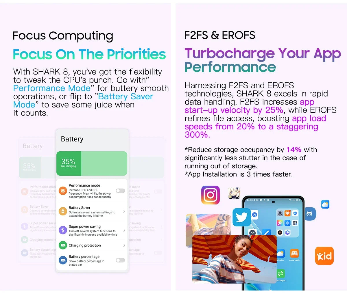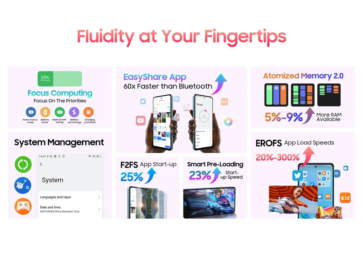Harnessing F2FS and EROFS technologies, SHARK 8 excels in rapid data handling. F2FS increases app start-up velocity by 25%, while EROFS refines file access, boosting app load speeds from 20% to a staggering 300%. Smart Pre-Loading