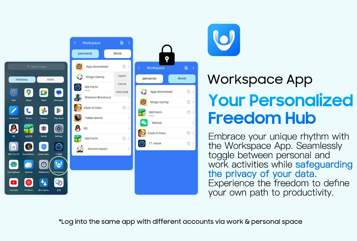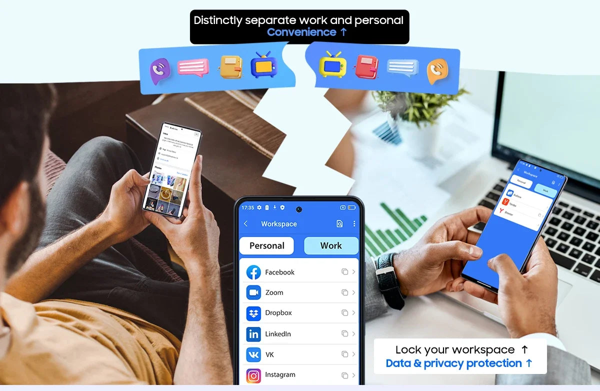Embrace your unique rhythm with the Workspace App. Seamlessly toggle between personal and work activities while safeguarding the privacy of your data. Experience the freedom to define your own path to productivity.