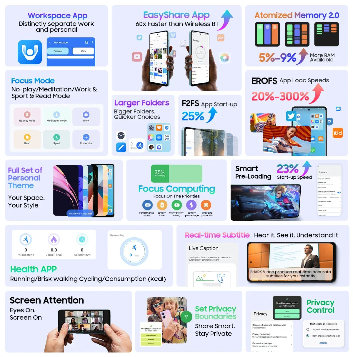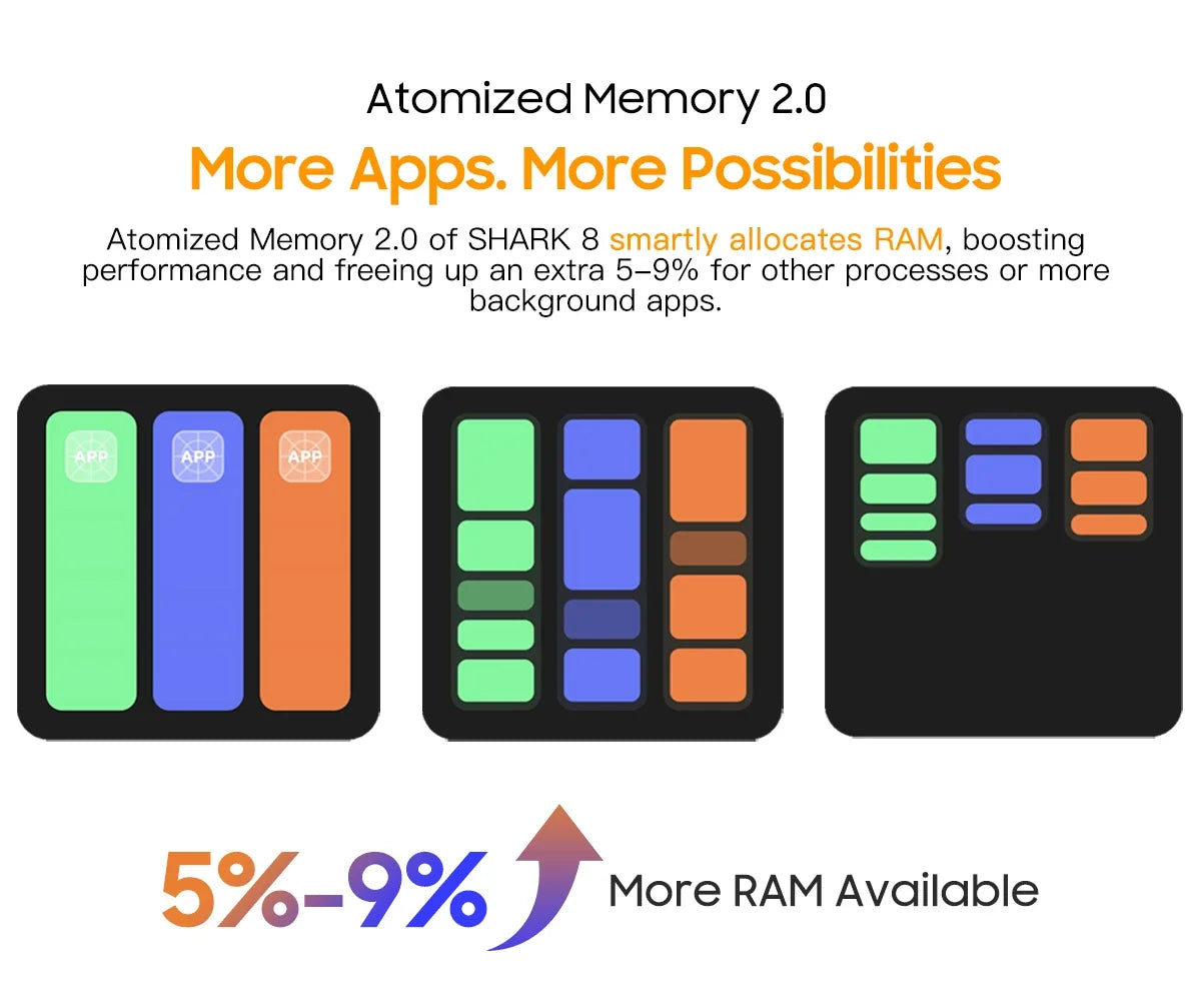 Atomized Memory 2.0of SHARK 8 smartly allocates RAM, boosting performance and freeing up an extra 5-9% for other processes or more background apps. Focus Computing