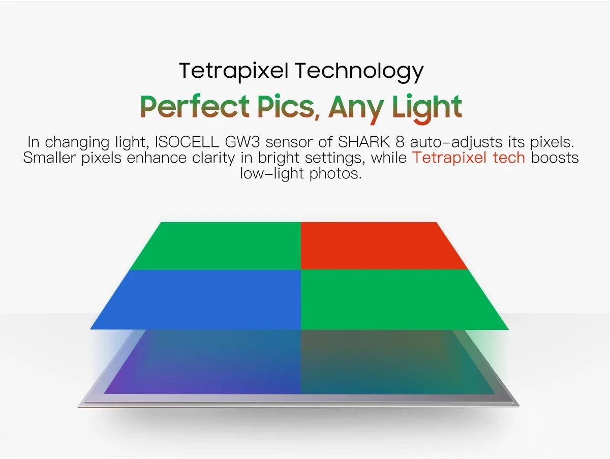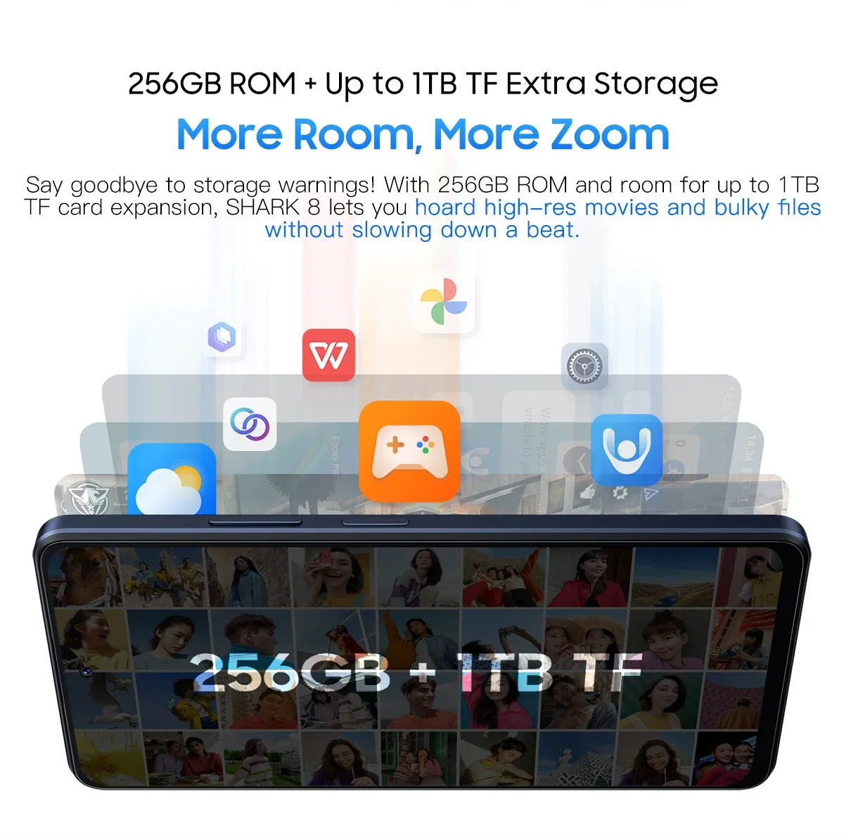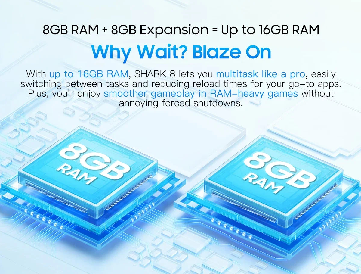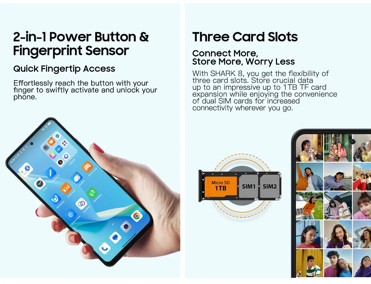 With up to 16GB RAM, SHARK 8 lets you multitask like a pro, easily switching between tasks and reducing reload times for your go-to apps. Plus, you'll enjoy smoother gameplay in RAM-heavy games without annoying forced shutdowns. 256GB ROM +Up to 1TB TFExtra Storage