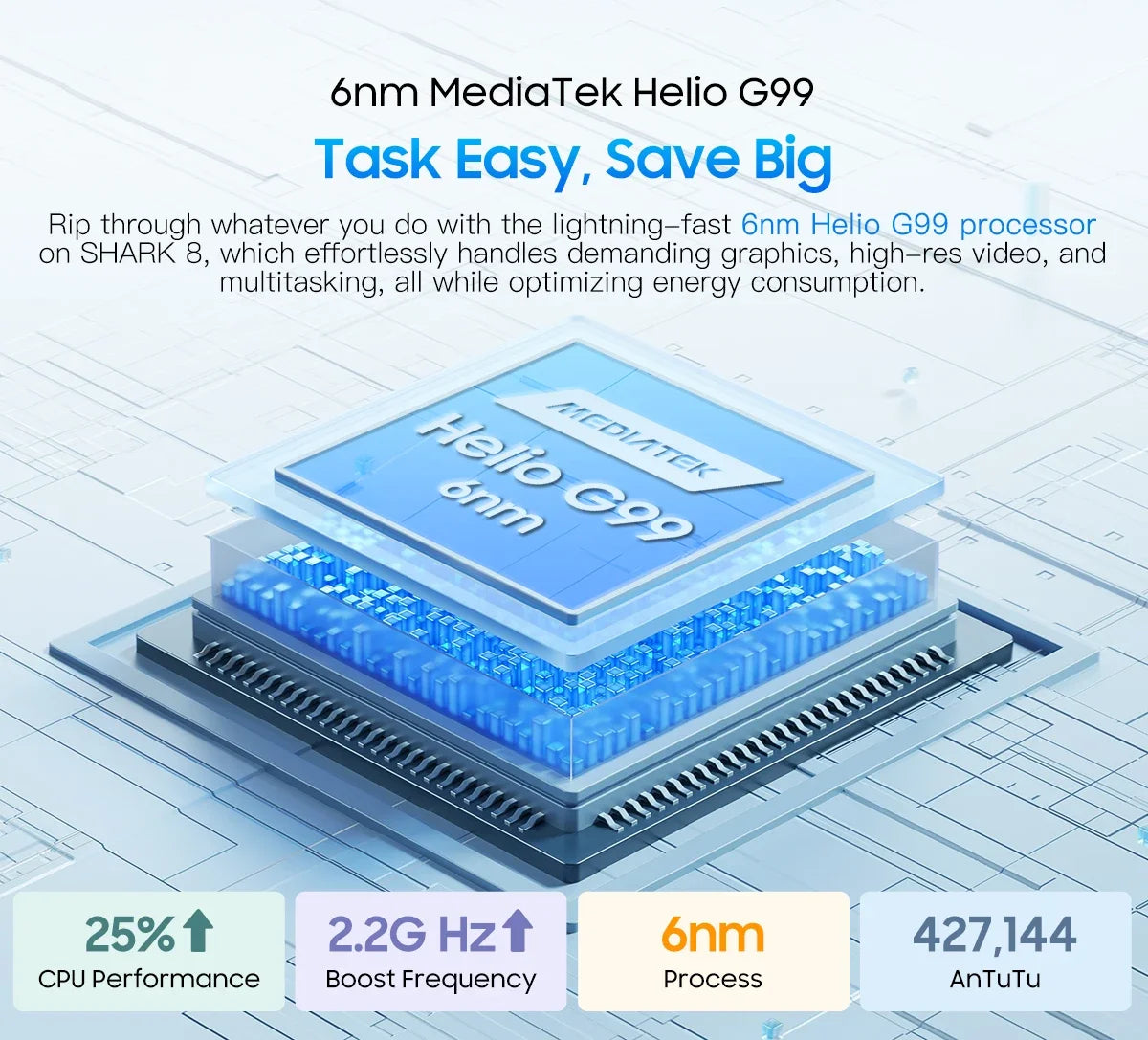 Rip through whatever you do with the lightning-fast 6nm Helio G99 processor on SHARK 8, which effortlessly handles demanding graphics, high-res video, and multitasking, all while optimizing energy consumption. HyperEngine 2.0 Lite Gaming Technologies
