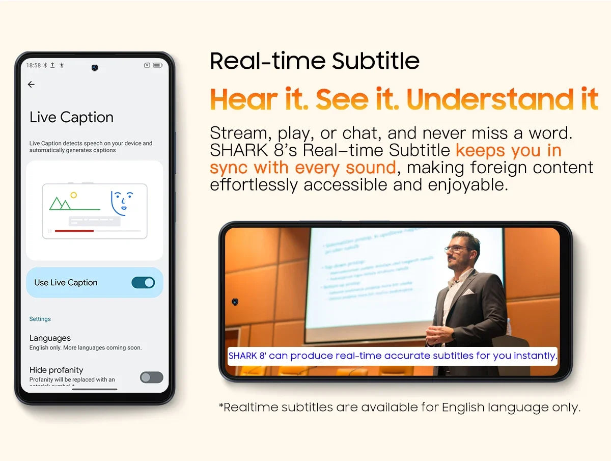 Stream, play, or chat, and never miss a word. SHARK 8's Real-time Subtitle keeps you in sync with every sound, making foreign content effortlessly accessible and enjoyable. Screen Attention
