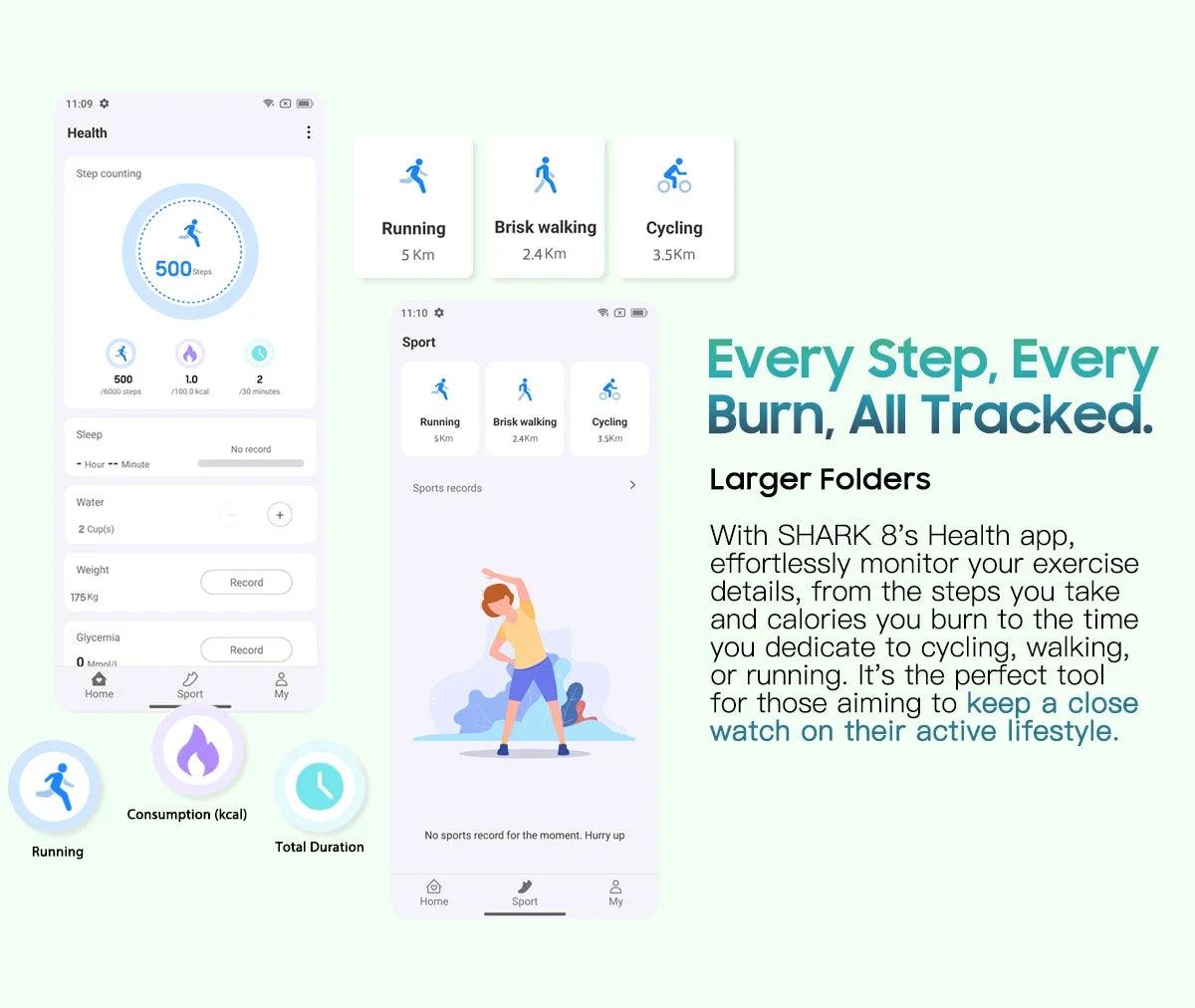 With SHARK 8's Health app, effortlessly monitor your exercise details, from the steps you take and calories you burn to the time you dedicate to cycling, walking, or running. It's the perfect tool for those aiming to keep a close watch on their active lifestyle. IntuitivePro Mode