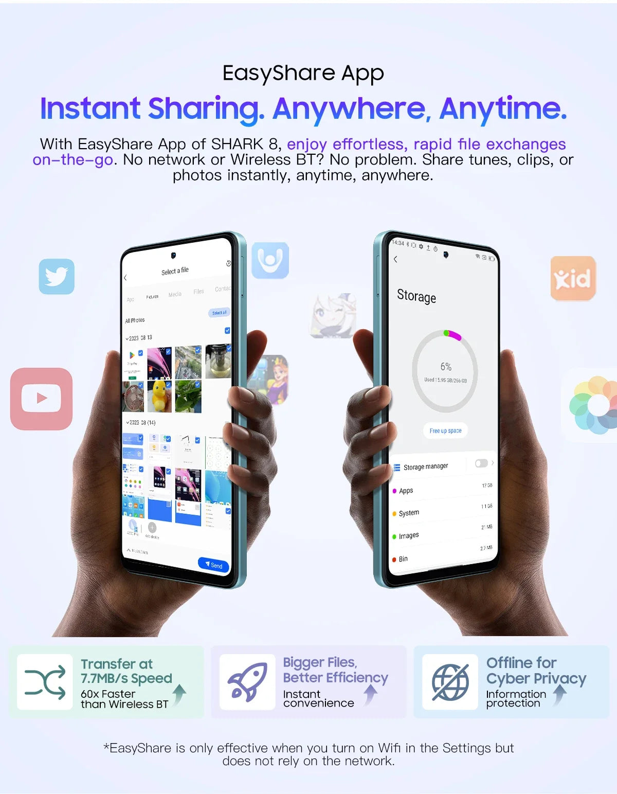 With EasyShare Appof SHARK 8, enjoy effortless, rapid file exchanges on-the-go. No network or Bluetooth? No problem.Share tunes, clips, or photos instantly, anytime, anywhere. Atomized Memory 2.0