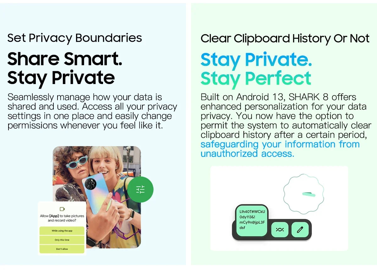 Built on Android 13, SHARK 8 offers enhanced personalization for your data privacy. You now have the option to permit the system to automatically clear clipboard history after a certain period, safeguarding your information from unauthorized access.
