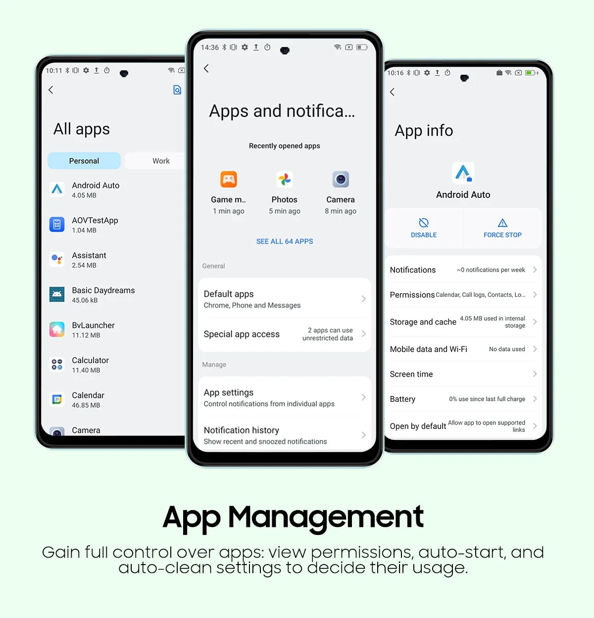 Gain full control over apps: view permissions, auto-start, and auto-clean settings to decide their usage. Workspace App