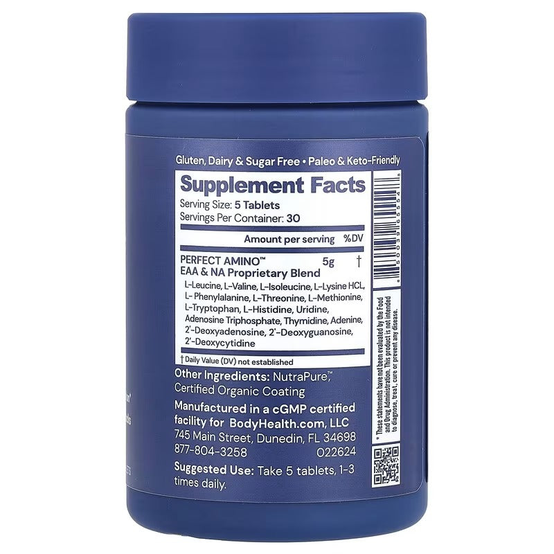 BodyHealth Perfect Amino™ provides a complete essential amino acid formula to support muscle maintenance, recovery, and overall wellness. Its coated tablet design ensures convenient daily supplementation.