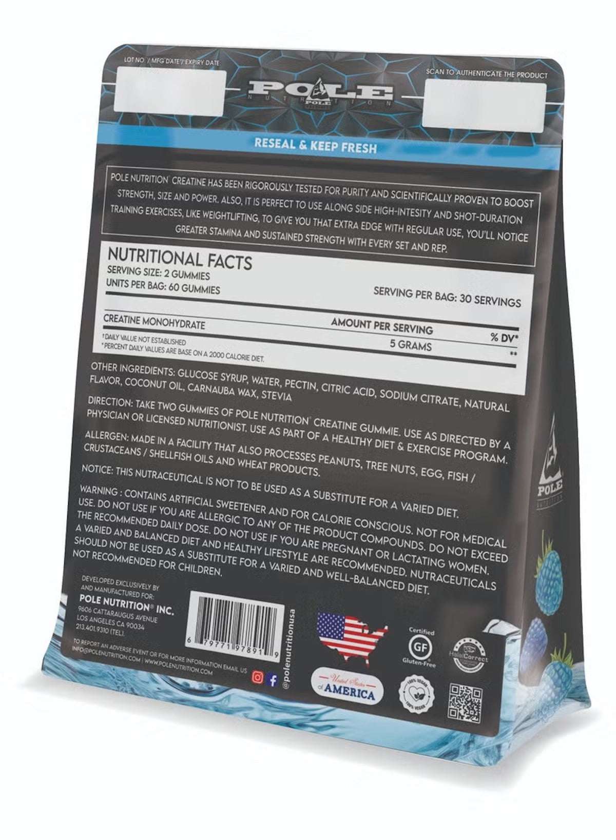 Pole Nutrition Creatine Gummies deliver 5000mg of pure creatine monohydrate in a convenient, sugar-free gummy form. Designed for athletes, lifters, and fitness enthusiasts, these gummies help enhance muscle strength, endurance, and recovery. With a refreshing blue raspberry flavor, they offer an enjoyable and portable alternative to traditional creatine powders—no water or shaker required.
