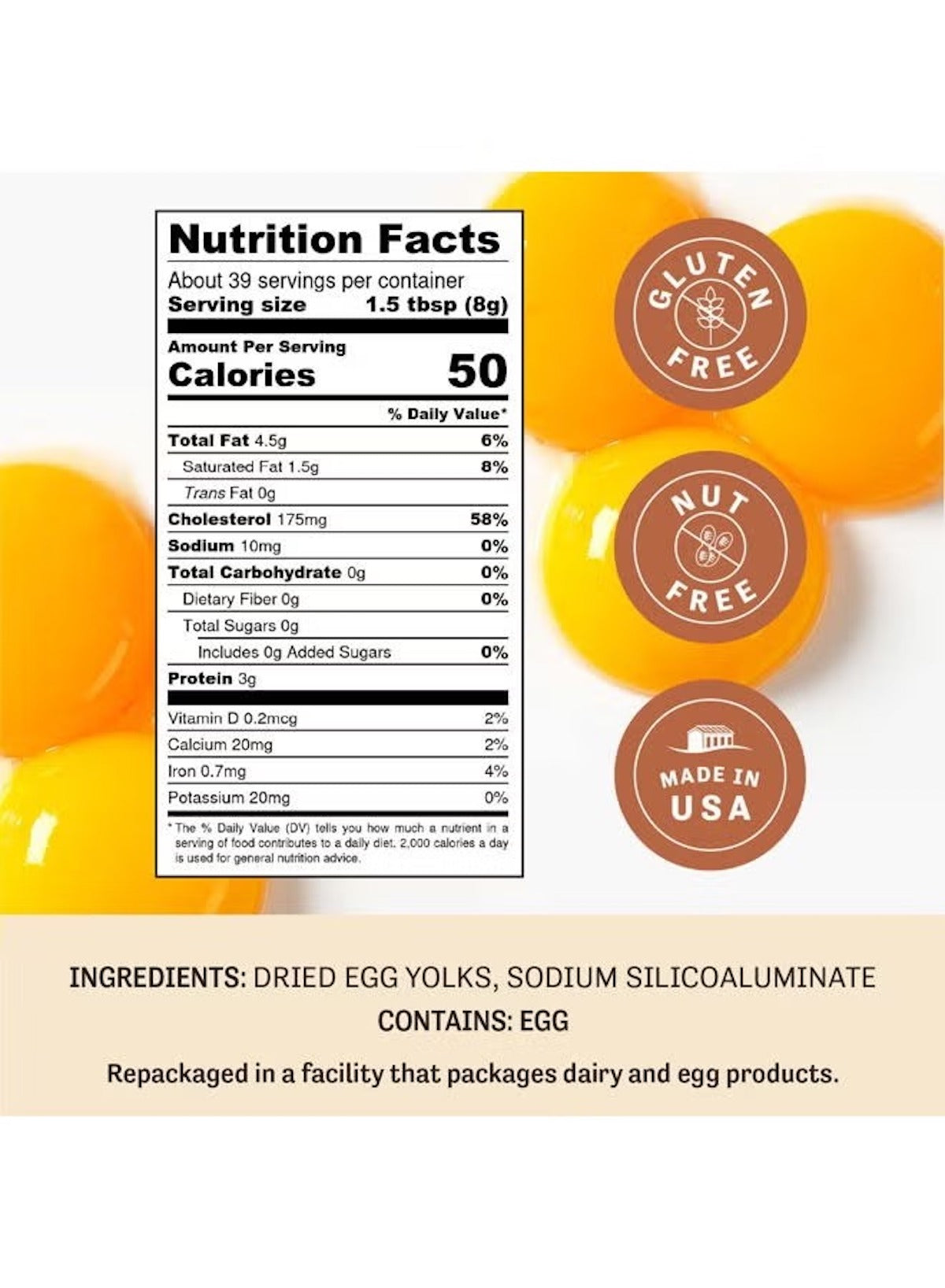 Ingredients: Pasteurized Dried Egg Yolk, Sodium Silicoaluminate