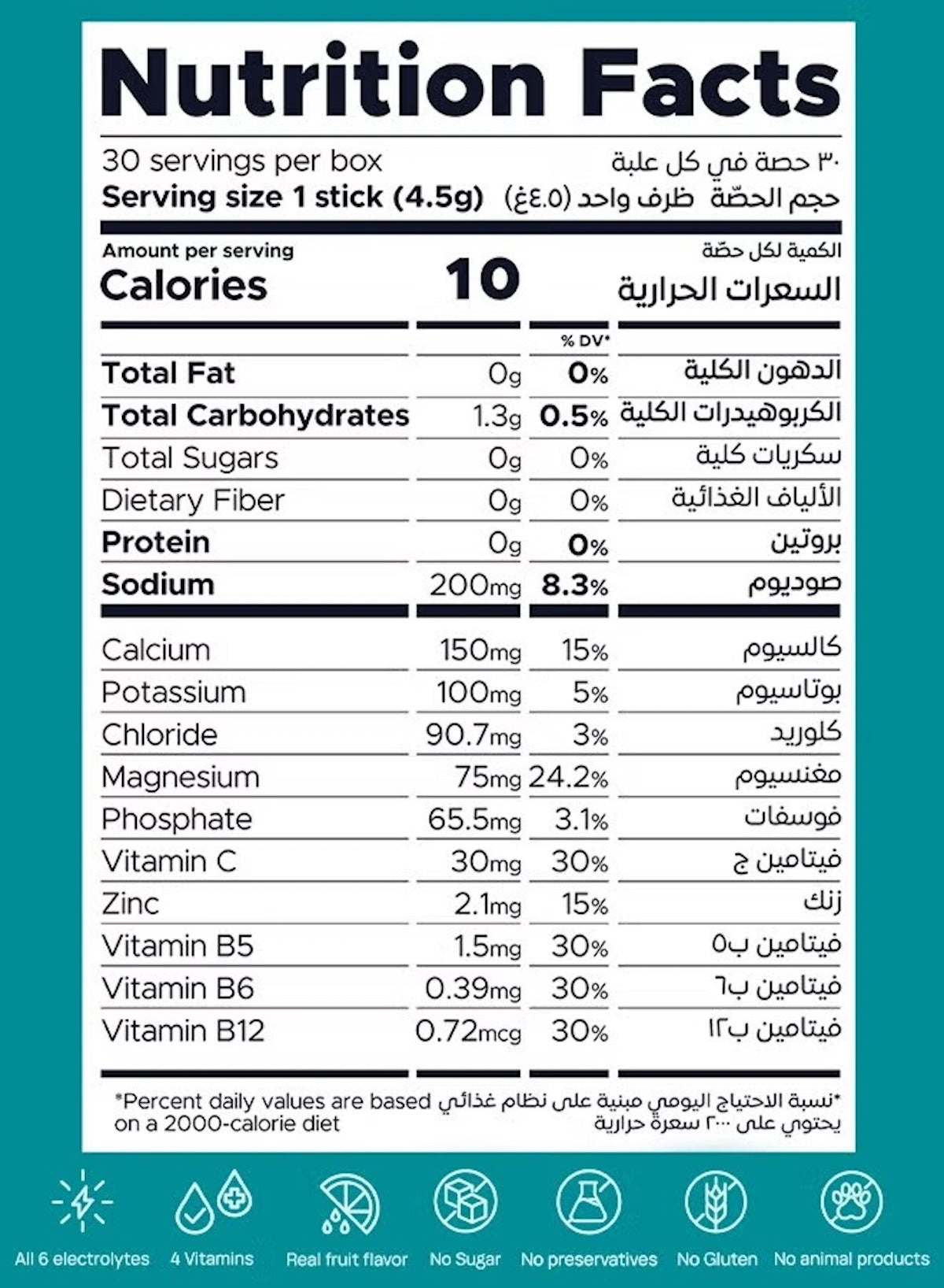 Active Ingredients: 6 Essential Electrolytes + 4 Vitamins + Zinc