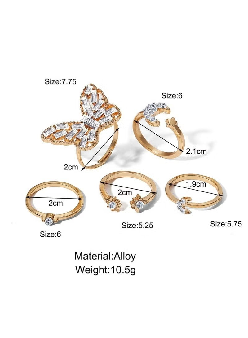 Elevate your jewelry collection with this 5-piece gold-plated ring set featuring butterfly, moon, and star designs adorned with sparkling crystals. Lightweight and adjustable, these rings can be stacked or worn individually for a chic, elegant look. Ideal for gifting or personal use.