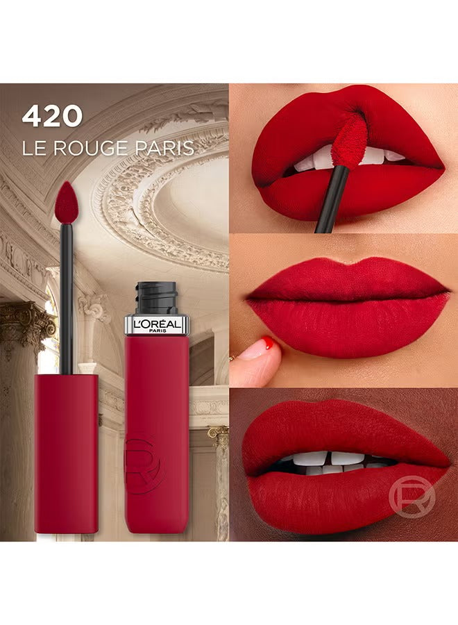 L’Oréal Paris Infaillible Le Matte Resistance Liquid Lipstick in 420 Le Rouge Paris delivers a bold, classic red with an ultra-matte finish that lasts up to 16 hours. The lightweight, flexible formula glides on smoothly, offering intense pigmentation with comfortable, transfer-resistant wear. Perfect for statement lips that stay flawless all day and night.