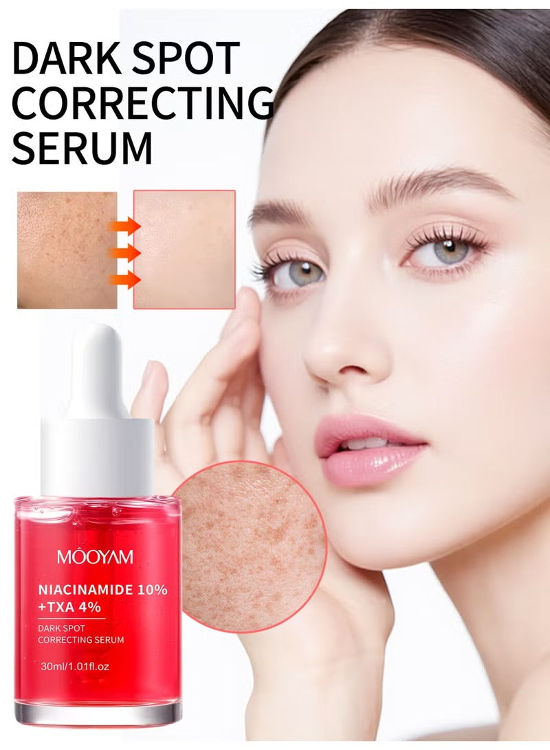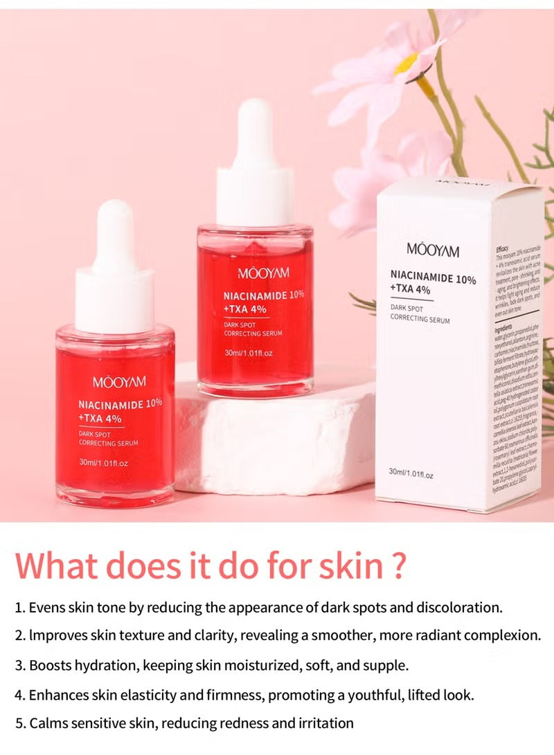 MOOYAM Niacinamide 10% + TXA 4% Serum is an advanced brightening treatment designed to reduce dark spots, post-acne marks, and hyperpigmentation. Powered by 10% Niacinamide and 4% Tranexamic Acid (TXA), it helps improve uneven skin tone, reduce discoloration, and strengthen the skin barrier. This fragrance-free, lightweight formula absorbs quickly, helping to smooth, clarify, and brighten the skin while supporting a healthier, more even complexion. Suitable for all skin types, including sensitive and acne-prone skin.
