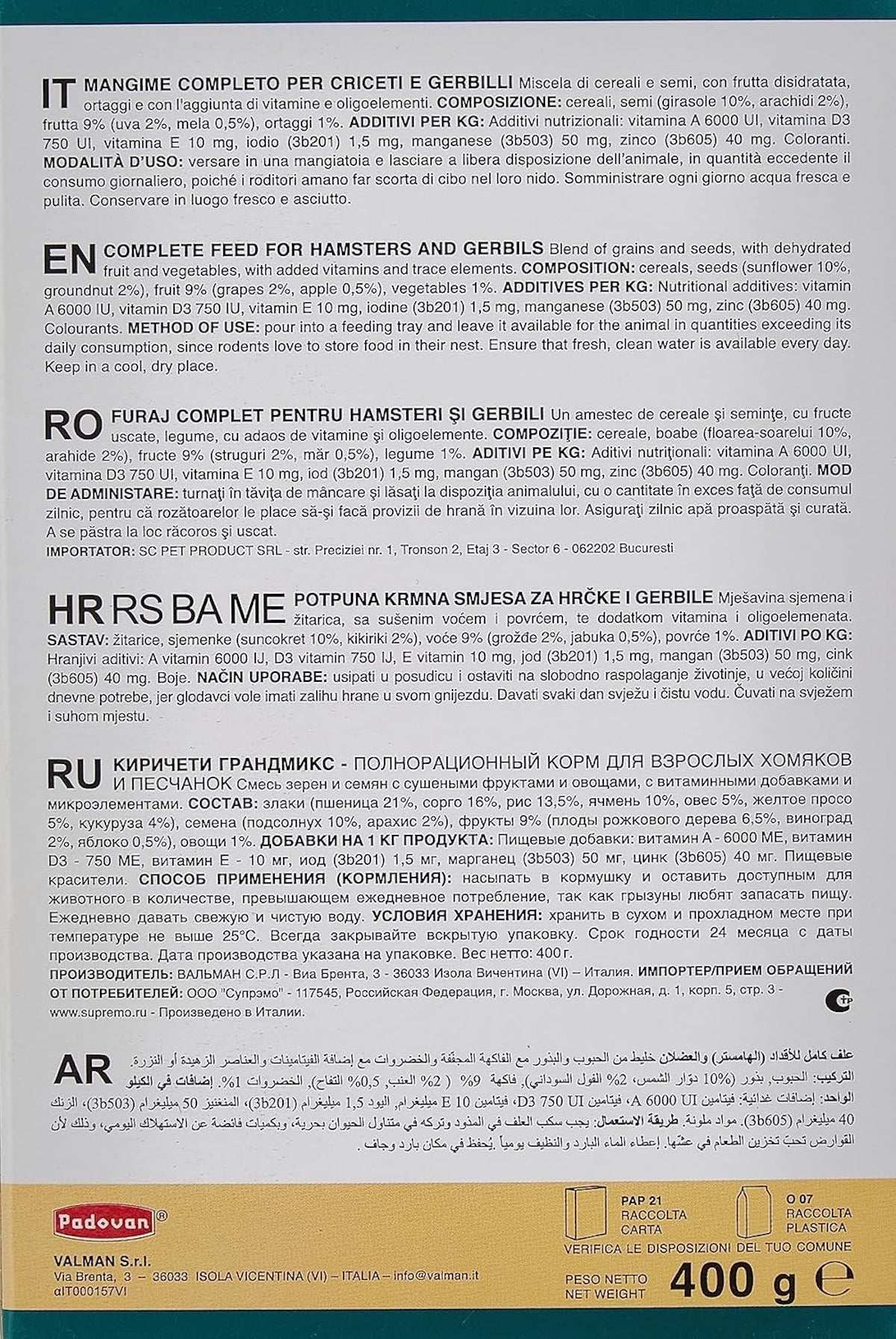 Padovan GrandMix Criceti is a complete, balanced food mix designed to meet the nutritional needs of small animals like hamsters and other rodents. This premium blend includes cereals, seeds, nuts, dried fruits, and vegetable granules that provide all the essential vitamins and minerals required for healthy growth, energy, and vitality. Enriched with added vitamins and honey, it promotes a shiny coat, healthy teeth, and optimal digestion. Padovan ensures your small pets receive the best nutrition inspired by nature.
