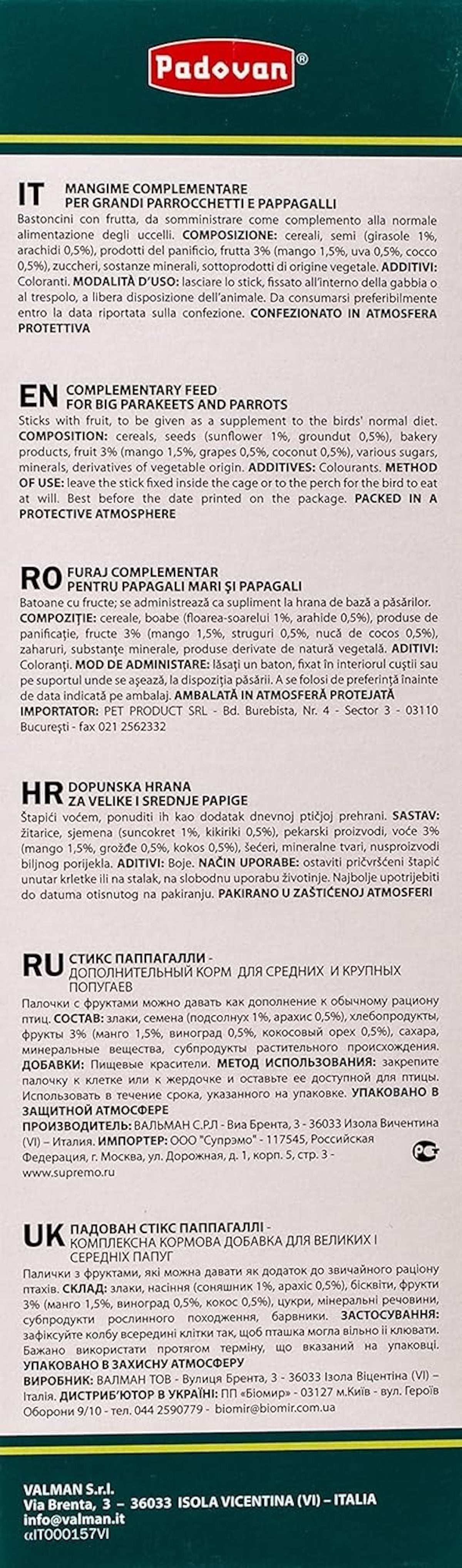 Padovan Stix Pappagalli is a premium treat for parrots made from a delicious mix of quality seeds, fruits, and bakery products, enriched with essential vitamins and minerals. These crunchy sticks are baked three times to ensure a firm texture that helps your bird exercise its beak while enjoying a tasty and nutritious snack. Easily attachable to the cage, these sticks provide both entertainment and nourishment for your parrot, supporting overall health and vitality.