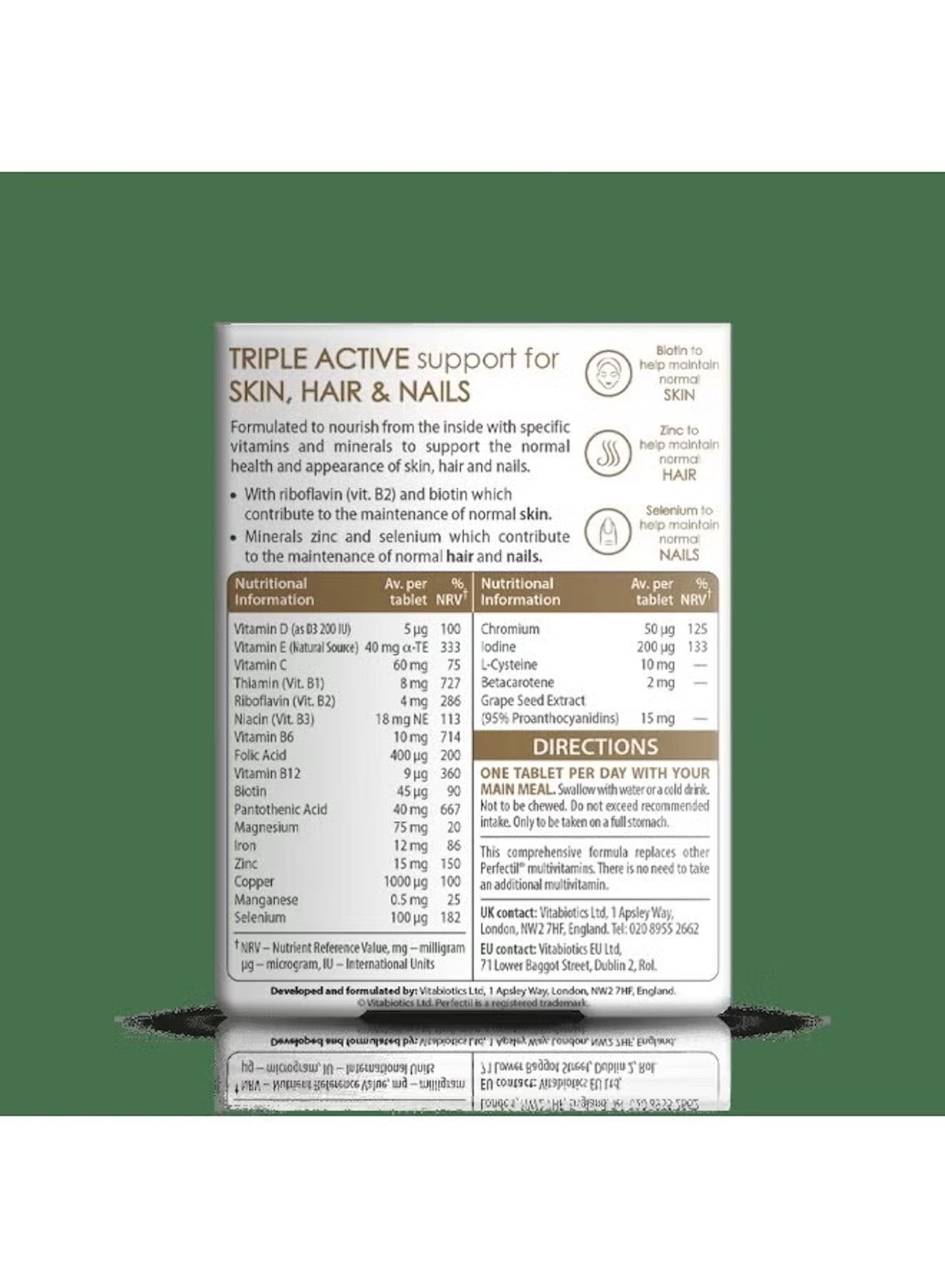 Perfectil Original by Vitabiotics is a complete beauty supplement formulated with Biotin, Zinc, and Vitamin C to support healthy skin, strong nails, and vibrant hair from within.