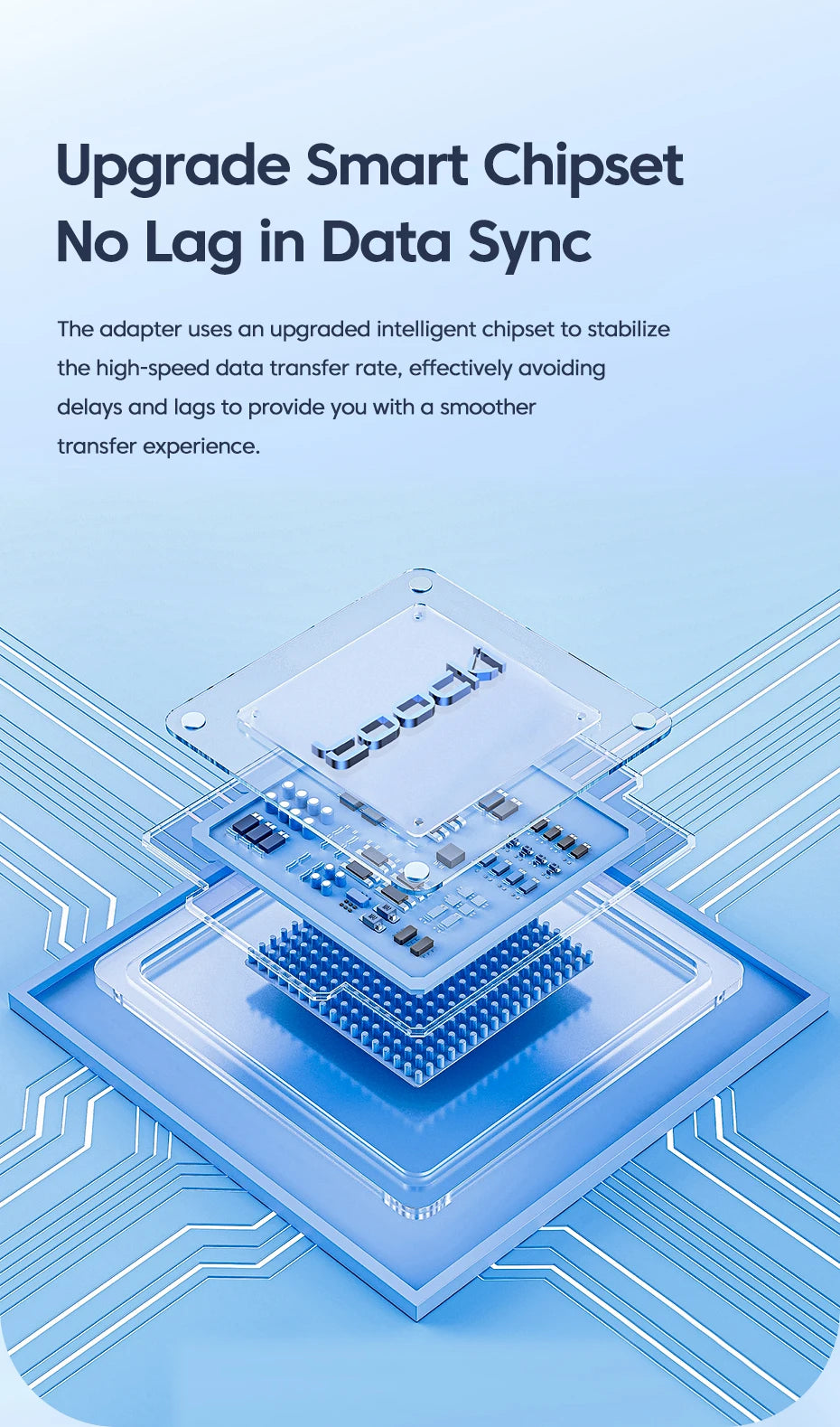 Upgrade Smart Chipset No Lag in Data Sync, The adapter uses an upgraded intelligent chipset to stabilize the high-speed data transfer rate,effectively avoiding delays and lags to provide you with a smoother transfer experience